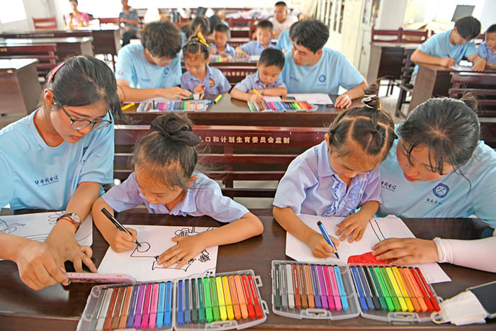 志愿者与孩子们一起画画。陈彬摄