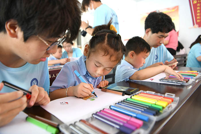 2022年6月28日,安徽理工大学大学生志愿者走进淮南市寿县堰口镇江黄村,与留守儿童一起绘画、做游戏,并为孩子们送上爱心书包、文具。当日,安徽理工大学大学生暑期“三下乡”社会实践活动走进淮南市寿县堰口镇江黄村,围绕乡村振兴产业发展、关爱留守儿童和老人、关注乡村生态环境等内容开展走访调研,为乡村振兴出谋划策,贡献青春力量。(陈彬)