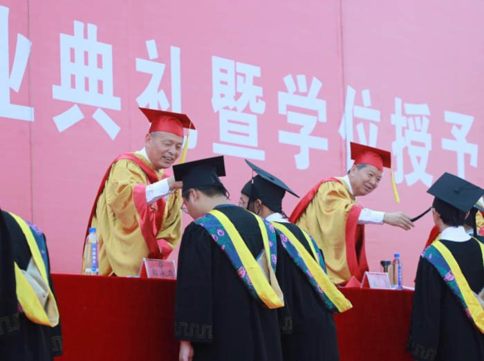 随后举行了学位授予仪式。身穿学位服的博士毕业生、硕士毕业生、本科毕业生依次走上主席台,由与会领导、校友为他们授予学位、扶苏拨穗,并送上美好祝愿。
