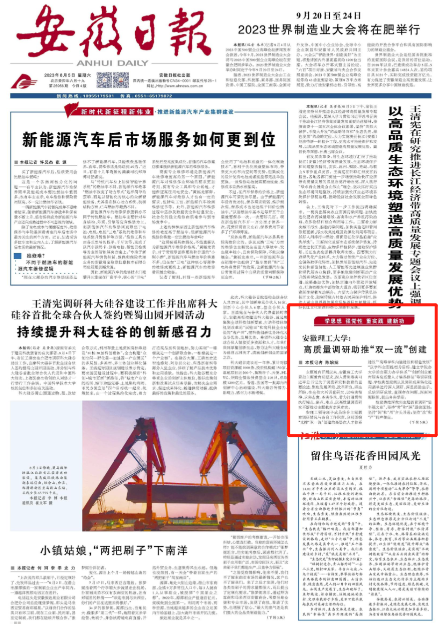 学校还聚焦加强本科教学内涵建设,及时调整专业布局,新增新能源科学与工程等2个新工科专业,获批省级基础学科拔尖学生创新人才培养基地。积极响应国家和安徽省区域经济社会发展战略需求,锚定创建“双一流”目标,深入实施“四个融入”发展战略,分别与合肥工业大学、清华大学合肥公共安全研究院签约联合培养“智能网联新能源汽车创新班”“城市安全创新班”,着力打造国内一流的科技创新平台和高层次人才培养基地,持续推动学校高质量发展再上新台阶。