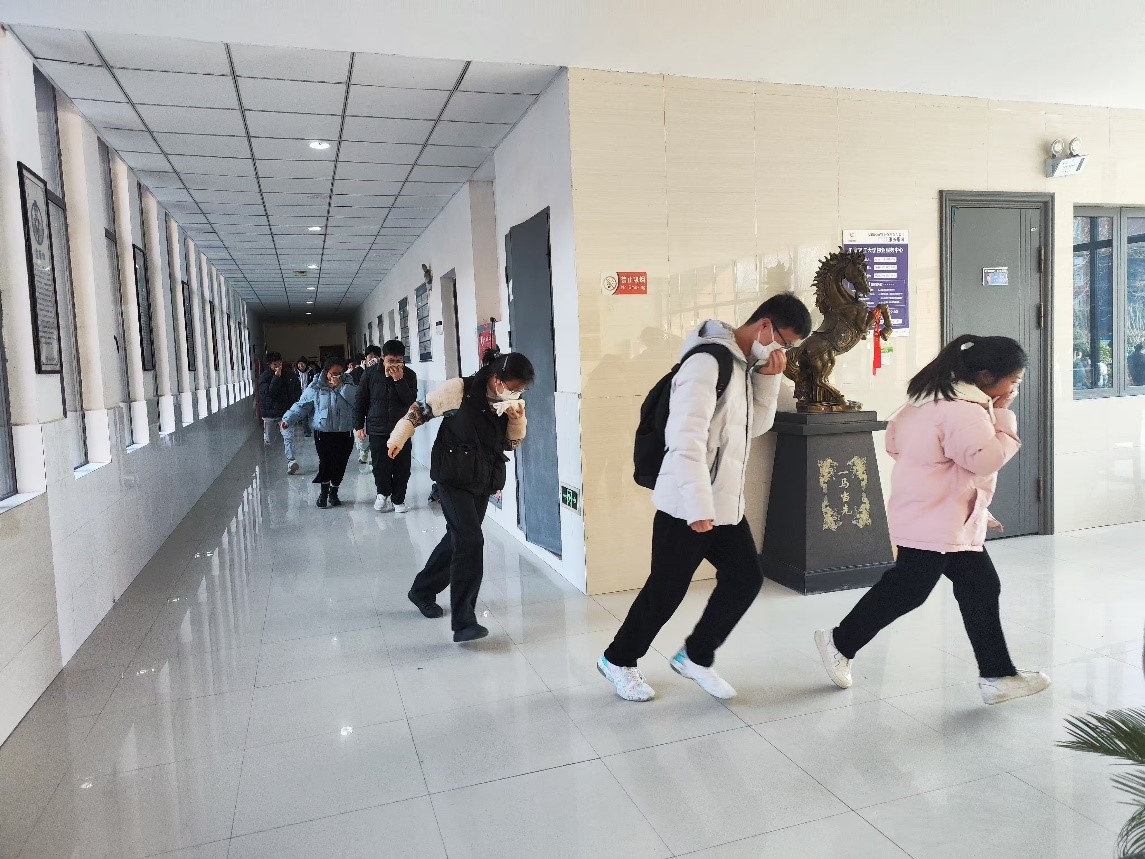 张可佳强调开展消防疏散演习和灭火演练的重要意义,希望参与的全体师生通过本次活动,增强安全观念和应急处理的能力。随后彭广锋老师详细讲解了疏散演习的目的、重要性及注意事项,随着火警警声响起,师生迅速用湿毛巾捂住口鼻,弯腰低姿,有序地从最近的逃生通道撤离。